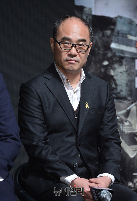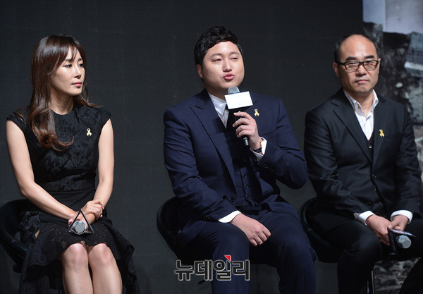 배우 문정희, 김대명, 강신일이 9일 오전 서울 압구정CGV에서 열린 영화 '판도라(감독각본 박정우)' 제작보고회에 노란리본 배지를 가슴에 달고 등장했다.