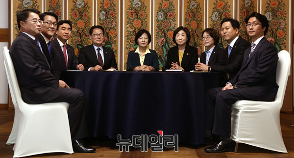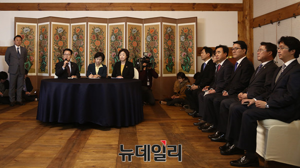 더불어민주당 추미애 대표, 국민의당 박지원 비상대책위원장, 정의당 심상정 대표가 9일 오전 국회 사랑재에서 야3당 대표 회담을 갖고 있다.