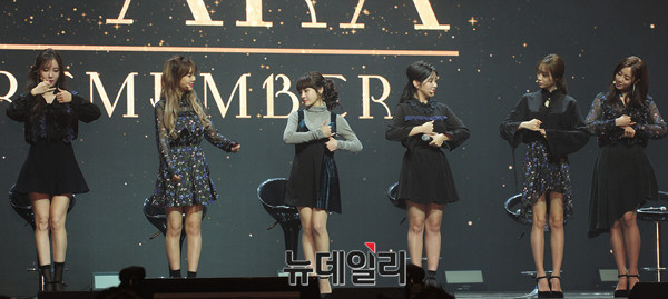티아라(T-ARA : 보람, 지연, 효민, 은정, 큐리, 소연)가 9일 오후 서울 용산구 블루스퀘어에서 열린 12번째 미니앨범 '리멤버(REMEMBER)' 쇼케이스에서 수화로 된 포인트 안무를 선보이고 있다.