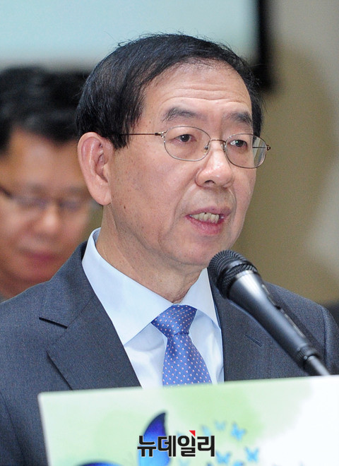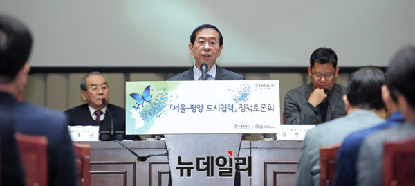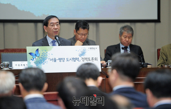 박원순 서울시장이 10일 오전 서울시청에서 열린 '서울-평양 도시협력 정책토론회'에서 기조연설을 하고 있다. 박 시장은 이날 기조연설을 통해 '평양에 인프라 신설 지원 등 두 도시 간 포괄적 협력 구상안'을 발표했다. 이어 "남북이 지속 가능한 교류를 다시 시작해야 한다"고 밝혔다.