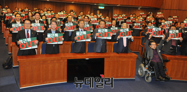 국민의당 제1차 중앙위원회의가 10일 오후 국회 헌정기념관에서 열린 가운데 박지원 비대위원장, 안철수 전 대표 등 참석자들이 박근혜 대통령 규탄 피켓을 들고 구호를 하고 있다.
