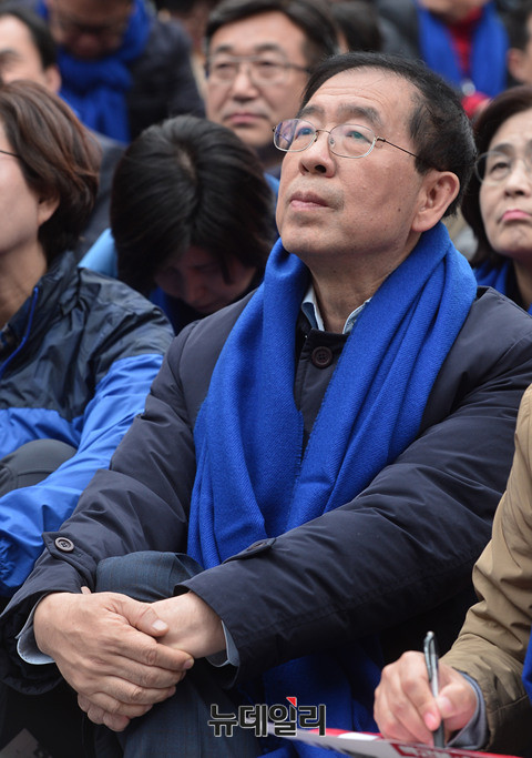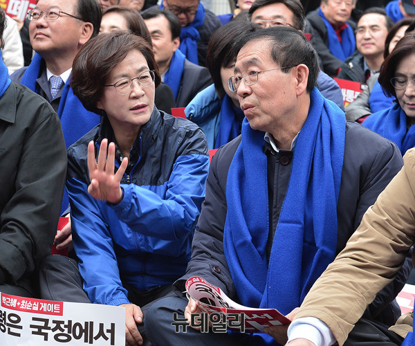 박원순 서울시장이 12일 오후 청계천 모전교 일대에서 열리고 있는 더불어민주당 정권 규탄 집회에 참석해 임의행진곡을 합창하고 있다.