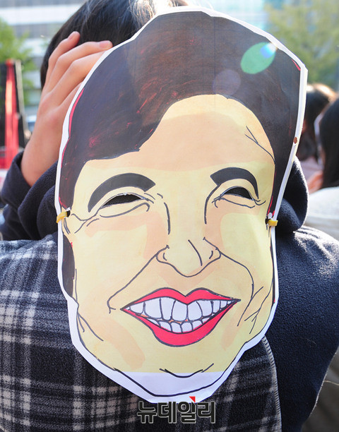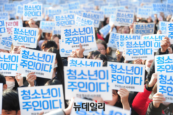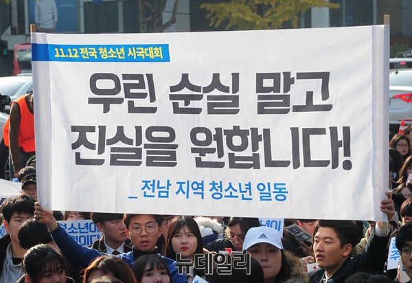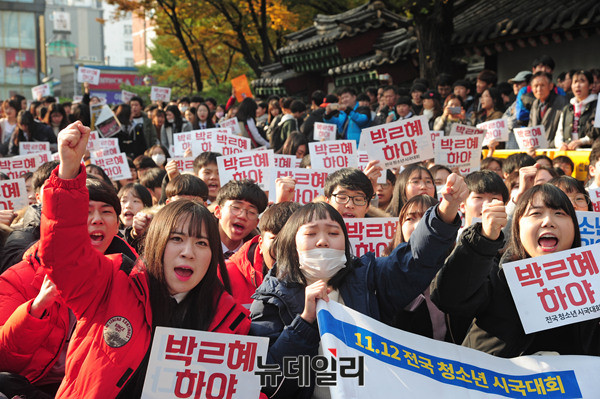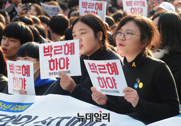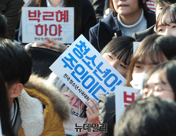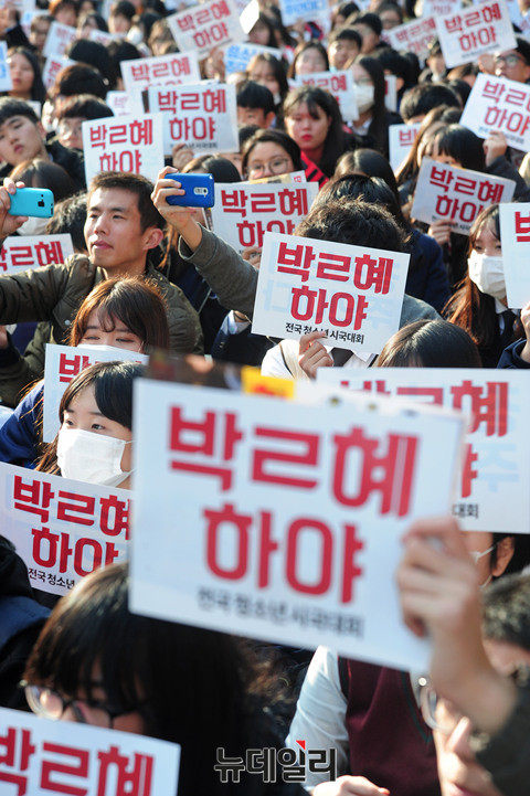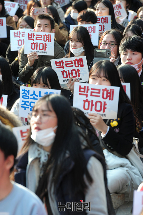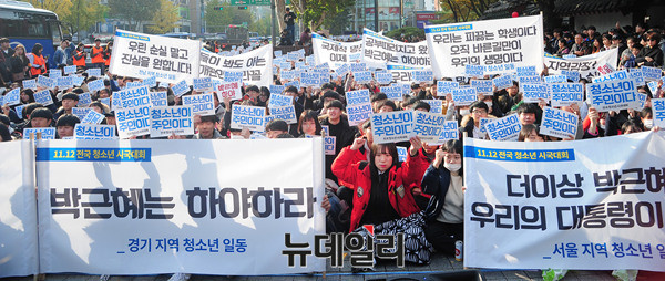 21세기청소년공동체희망 회원과 20여개 청소년 단체가 12일 오후 서울 종로구 탑골공원에서 열린 '청소년시국대회'에서 손피켓을 들고 "박근혜 하야하라"라는 구호를 외치고 있다.