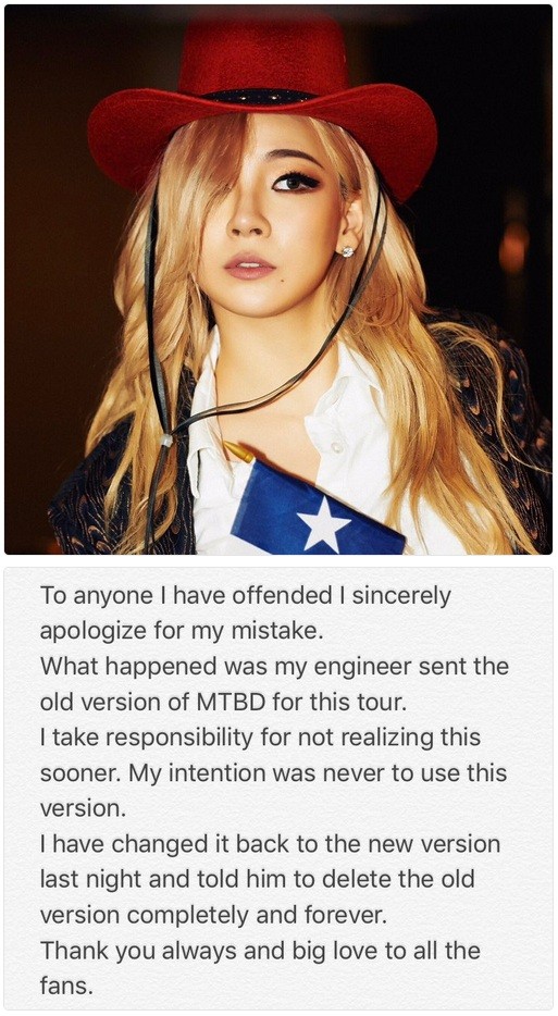 씨엘은 "콘서트 직후 다시금 '멘붕'에 삽입된 코란이 도마 위에 오르자 불편함을 느낀 모든 분들에게 진심으로 사과드린다"며 "(자신의)엔지니어가 실수로 '구 버전'을 보내와 이런 일이 발생했지만, 결과적으로 음원을 제대로 살피지 못한 내 책임이 크다"고 밝혔습니다.