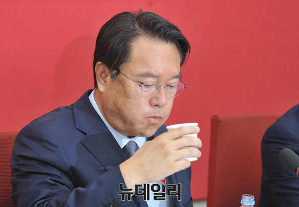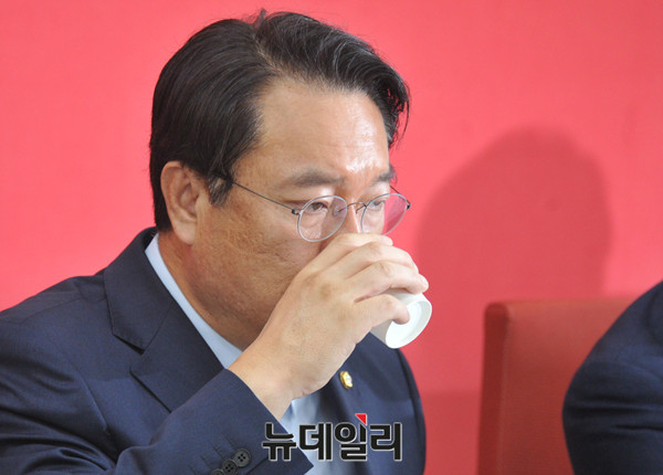 새누리당 정진석 원내대표가 15일 오전 국회에서 열린 원내대책회의에서 물을 마시고 있다.