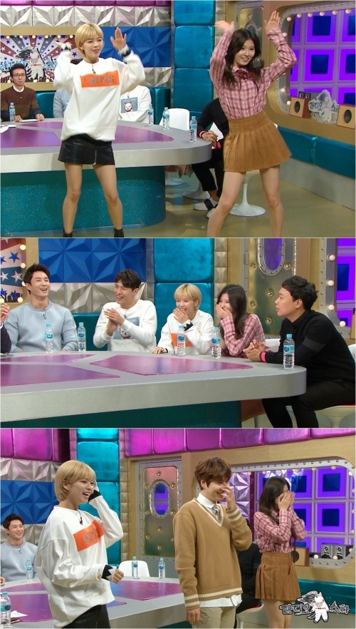 트와이스 정연-사나가 '라디오스타' 첫 출격해 선배 규현과 3인조 유닛을 깜짝 결성했다.16일 방송될 MBC '라디오스타'는 '내 이름도 모르면 너무해 너무해' 특집으로 심형탁-송재희-정연 사나(트와이스)-이상준이 출연한다.이날 요즘 가장 핫한 걸그룹 트와이스의 정연과 사나는 'Cheer up' 2배속 댄스부터 방송 최초로 '3배속 TT'를 공개했다. 공개된 사진처럼 두 사람은 빠른 속도에도 흐트러짐 없는 상큼한 댄스를 선보여 스튜디오를 환하게 밝혔다.특히, 규현은 정연-사나와 함께 3인조 유닛을 즉석 결성할 예정이다. 규현은 "영광이네요. 트와이스와 같이 춤을.."이라며 수줍어하면서도 정연과 사나 사이 센터를 차지하면서 이들과 완벽 호흡을 자랑했다는 후문이다.또, 정연은 자신의 친언니인 공승연의 SM연습생 시절부터의 이상형이 규현이었다고 밝혀 이목을 집중시켰다. 정연의 깜짝 고백으로 규현의 얼굴을 발그레하게 만들었는데, 이에는 깜짝 놀랄만한 대반전이 있다고.MBC 수요 예능 '라디오스타'는 16일 오후 11시 10분 방송된다.['라디오스타' 트와이스 정연 사나, 사진=MBC]