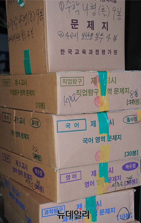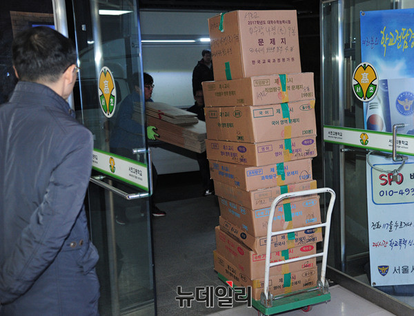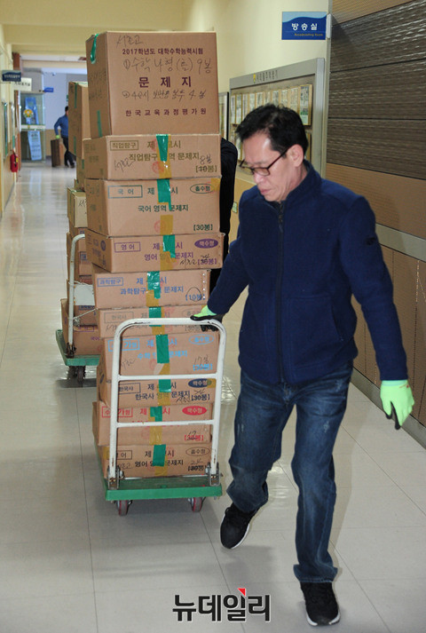 2017학년도 대학수학능력시험지가 17일 새벽 서울 서초고등학교(제 18시험지구 11시험장)에 도착해 옮겨지고 있다.