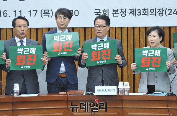 박지원 국민의당 비대위원장과 당무위원들이 17일 오전 국회에서 열린 국민의당 제1차 당무위원회의에서 '박근혜 퇴진' 피켓을 들고 있다.
