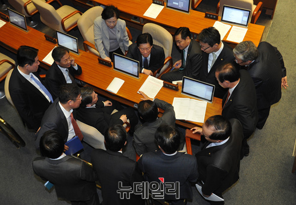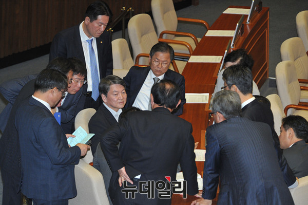 국민의당 박지원 비대위원장, 안철수 전 대표, 천정배 전 대표 등 소속 의원들이 17일 오후 국회에서 열린 본회의에서 최순실 특검법이 통과 후 모여 대화를 나누고 있다.