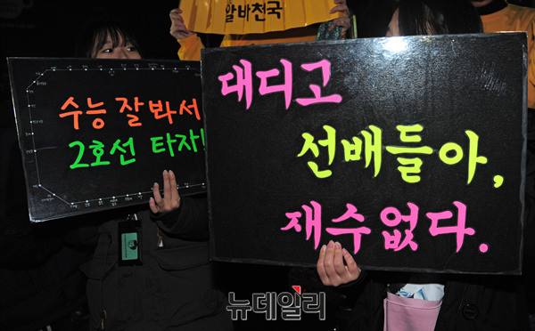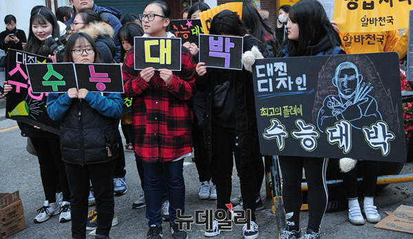 2017학년도 대학수학능력시험이 시행된 17일 오전 서울 서초고등학교(제 18시험지구 11시험장)앞에 수험생 후배들이 입장 전 부터 선배들을 응원하고 있다.