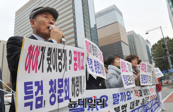 나라사랑어머니연합을 비롯한 12개 애국단체들은 18일 종로구 세종대로 사거리에서 "적과 내통한 문재인을 특검으로! 불법 대북 송금한 박지원을 청문회로 보내라!"를 주제로 기자회견을 갖고 있다.