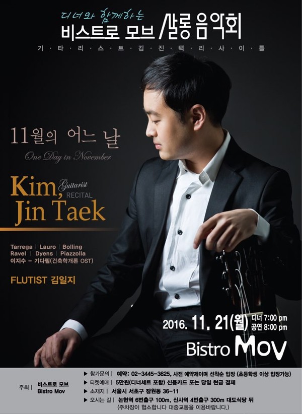 앞서 지난 7일 첼리스트 전소영을 초청, 성황리에 공연을 마친 '비스트로 모브'는 오는 21일 오후 8시 기타리스트 김진택과 플루티스트 김일지가 선보이는 '11월의 어느날' 디너 콘서트를 개최할 예정이다.