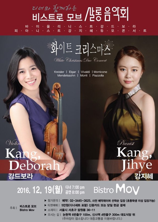 크리스마를 앞둔 12월에도 공연은 이어진다. '비스트로 모브'는 12월 19일 바이올리스트 강드보라와 피아니스트 강지혜를 초청, 'Fritz Kreisler - Liebesfreud(사랑의 기쁨)', 'Edward Elgar - Salut d'amour(사랑의 인사)', 'Ennio Morricone - Nella Fantasia(넬라 판타지아)' 등 주옥 같은 명곡들을 연주하는 '듀오 콘서트 - 화이트 크리스마스'를 열 계획이다.