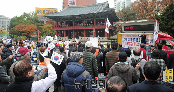 애국여성연합은 18일 오후 서울 보신각에서 박근혜 대통령 하야 반대집회를 열고 "대통령의 잘잘못 여부는 길거리 민심이 아니라 법의 심판에 맡겨야 한다"고 주장했다.
