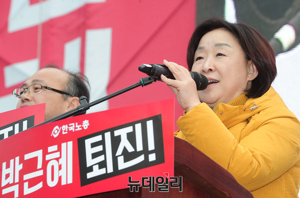 정의당 심상정 대표가 19일 오후 서울광장에서 열린 '2016 전국노동자대회'에 참석해 발언하고 있다. 심 대표는 이날 "우리는 박 대통령 한 사람을 바꾸려고 여기에 온 게 아니다"라며 "대통령·정부·검찰·언론·재벌·국회까지 공고한 카르텔(연합)을 형성한 기득권 질서를 근본적으로 뿌리 뽑는 대개혁에 나서야 한다"고 말했다.