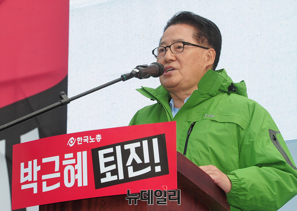 국민의당 박지원 비상대책위원장이 19일 오후 서울광장에서 열린 '2016 전국노동자대회'에 참석해 발언하고 있다. 박 위원장은 "국민의당은 가장 먼저 박 대통령의 퇴진을 당론으로 결정했다"며 "박 대통령의 퇴진 요구를 청와대가 알아들을 수 있도록 (여러분들에게) 구호를 부탁한다"고 말했다.