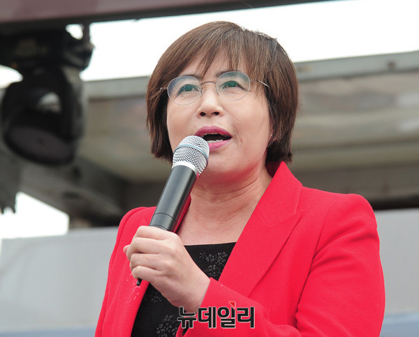 자유통일문화원 이애란 원장이 19일 오후 서울역 광장에서 열린 '헌법수호를위한국민의외침1차집회'에 참석해 발언하고 있다. 이 원장은 "법치가 없으면 북한 같은 나라가 된다"며 법률이 정한 기준과 절차가 아닌, 광장의 촛불에 기댄 정치권의 하야 요구에 안타까움을 나타냈다.