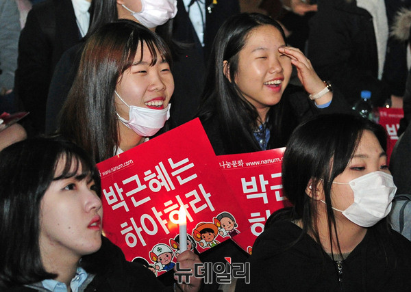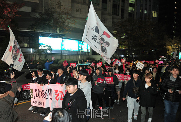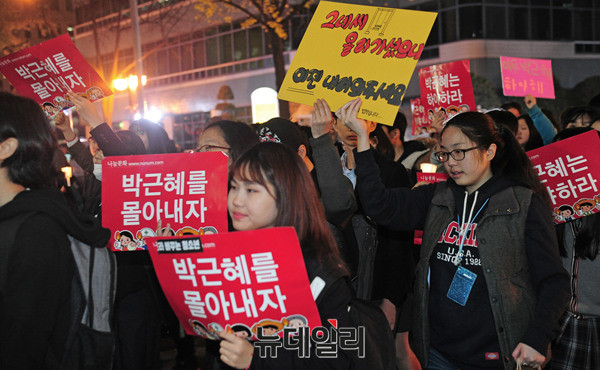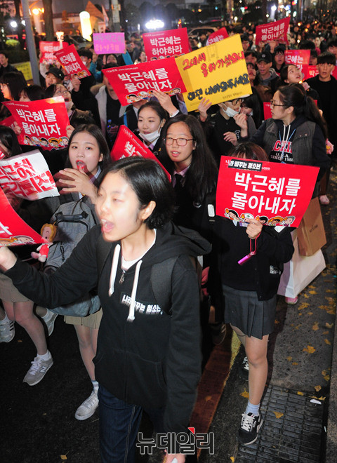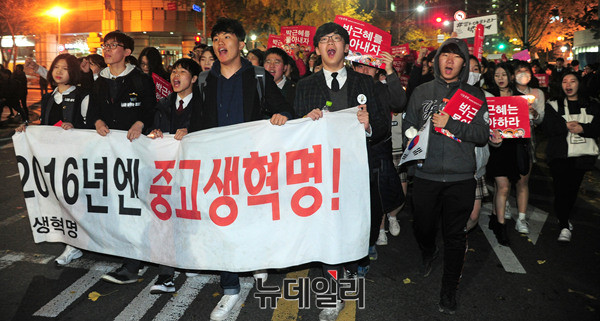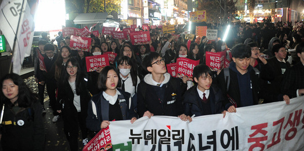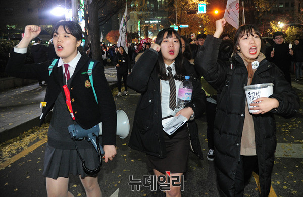 박근혜 대통령 하야를 요구하는 청소년들이 19일 오후 광화문 일대에서 "하야하라"는 구호를 외치며 행진을 하고 있다.