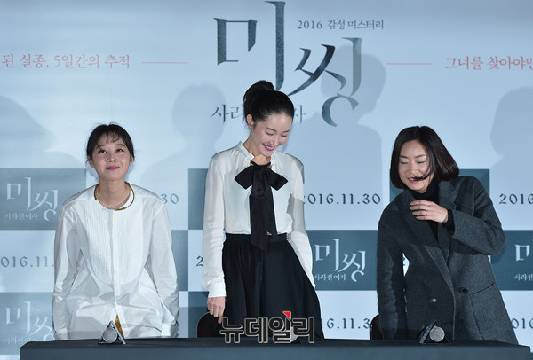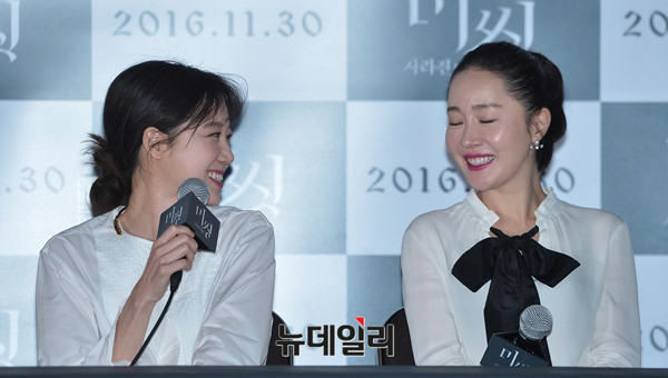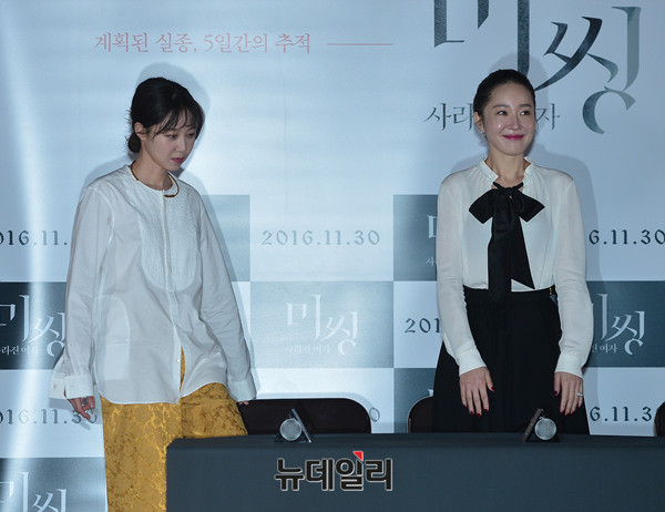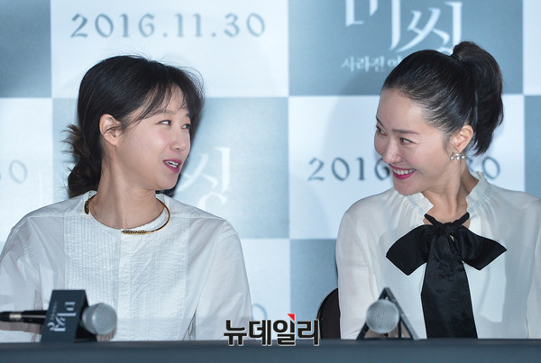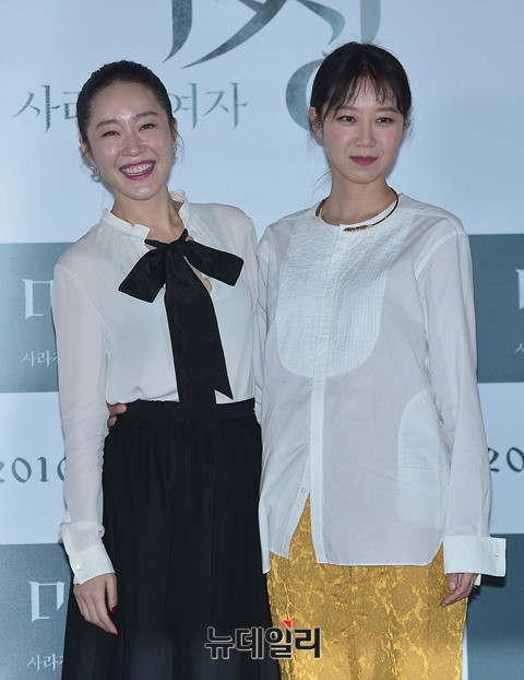 배우 엄지원과 공효진이 21일 오후 서울 중구 동대문메가박스에서 열린 영화 '미씽: 사라진 여자(감독 이언희)' 언론시사회에 참석해 대화를 나누고 있다.