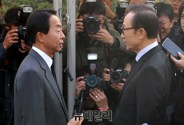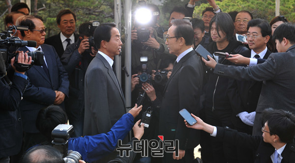 이명박 전 대통령이 21일 오후 서울 동작구 국립현충원 고(故) 김영삼 전 대통령 묘역을 찾아 참배를 마치고 김 전 대통령 차남 현철씨와 대화를 나누고 있다.