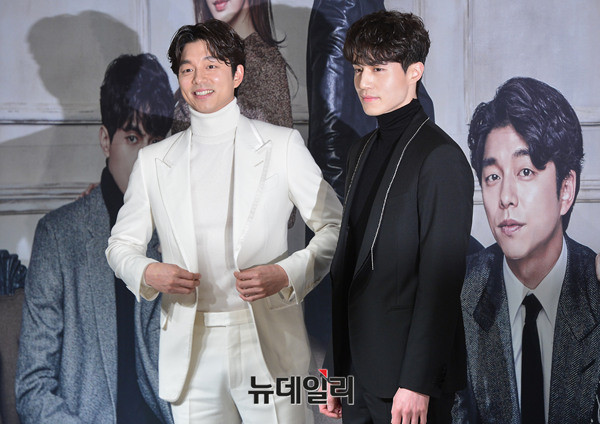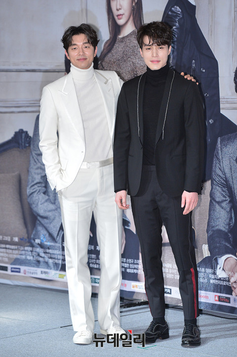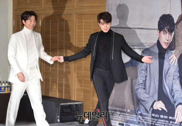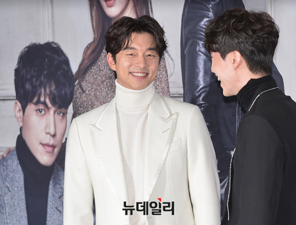 배우 공유와 이동욱이 22일 오후 서울 강남구 파티오나인에서 열린 tvN 10주년 특별기획 드라마 '쓸쓸하고 찬란하神-도깨비(극본 김은숙, 연출 이응복)' 제작보고회에 손을 잡고 입장하고 있다.