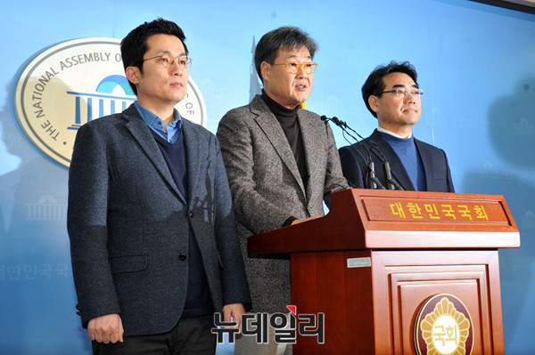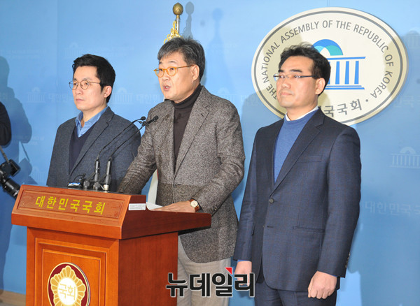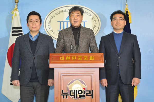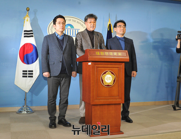 새누리당 원외당협위원장들(김상민, 정문헌, 이성권 전 의원)이 23일 국회 정론관에서 탈당 기자회견을 갖고 있다.