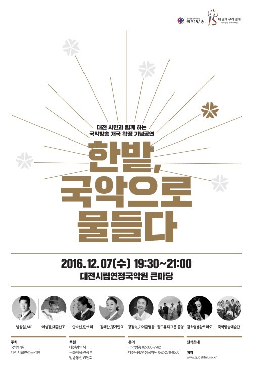 대전 국악방송은 내년 7월부터 주파수 FM 90.5 MHz에서 대전 및 세종특별시 일부에 24시간 송출될 예정이며, '한밭, 국악으로 물들다' 공연은 전석 무료이다.