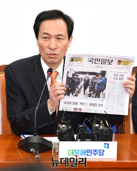 더불어민주당 우상호 원내대표가 24일 오전 국회 원내대표실에서 정책조정회의가 열린 가운데 지난 23일 정보보호협정 회의장 비공개에 항의해 사진기자들이 취재를 거부한 사진이 게재된 일간지를 들어 보이고 있다.
