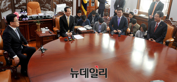 정세균 국회의장이 24일 오전 국회에서 여야 3당 정책위의장(국민의당 김성식, 새누리당 김광림, 더불어민주당 윤호중)과 회동을 갖고 있다.