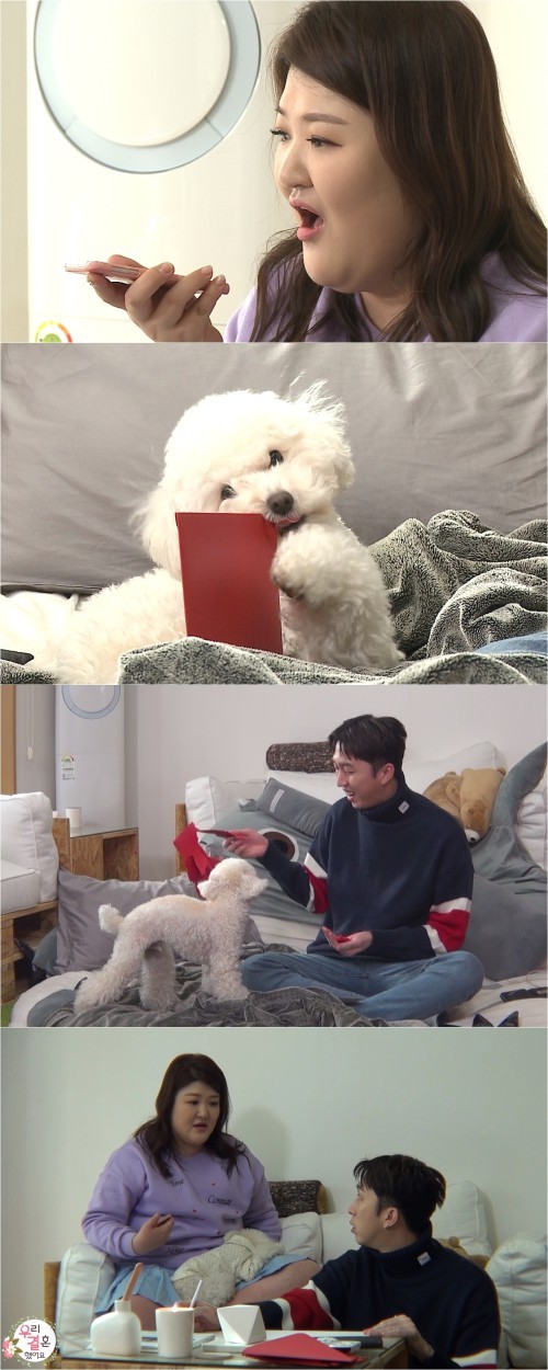 '우결' NEW 커플 슬리피 이국주가 결혼 첫날부터 난관을 예고해 궁금증을 자극한다.26일 방송될 MBC '우리 결혼했어요'(이하 '우결')에서는 새로운 커플로 합류한 슬리피-이국주의 첫 만남 모습이 공개된다.이날 슬리피-이국주는 '공식부부가 됐습니다'라는 메시지가 적힌 빨간색 미션카드를 받으며 바로 가상 결혼생활에 돌입한다. 두 사람은 각자 자신의 집에서 미션카드를 받고 떨리는 마음을 주체하지 못하며 설렘을 폭발시켰다는 후문이다.그러나 이들의 결혼생활이 시작부터 난관에 봉착할 것임이 예고됐다. 슬리피와 함께 살고 있는 반려견 퓨리는 빨간봉투를 보자마자 눈에 불을 키며 돌진해 이를 발기발기 찢었고, 슬리피는 이국주에게 "100조각이 났어"라며 하소연을 늘어놓았다.퓨리의 견제(?)를 접한 이국주는 크게 당황하며 "너무한다. 퓨리"라며 섭섭한 마음을 감추지 못했다. 하지만 이내 남편이 된 슬리피에게 더욱 예쁜 모습을 보여주기 위해 직접 꼼꼼하게 메이크업을 하는 등 영락없는 새색시의 모습으로 변신했다.또한 이국주는 김용건에게 주례를 부탁하는 과정에서 "드디어 꿈을 이루었네"라는 말을 듣자 얼굴이 빨개지는 등 숨겨뒀던 속마음을 들킨 것으로 알려져 더욱 궁금증을 자아낸다.슬리피 이국주의 좌충우돌 첫 만남 현장은 26일 오후 4시 55분 '우리 결혼했어요'를 통해 확인할 수 있다.['우리결혼했어요' 슬리피 이국주, 사진=MBC]