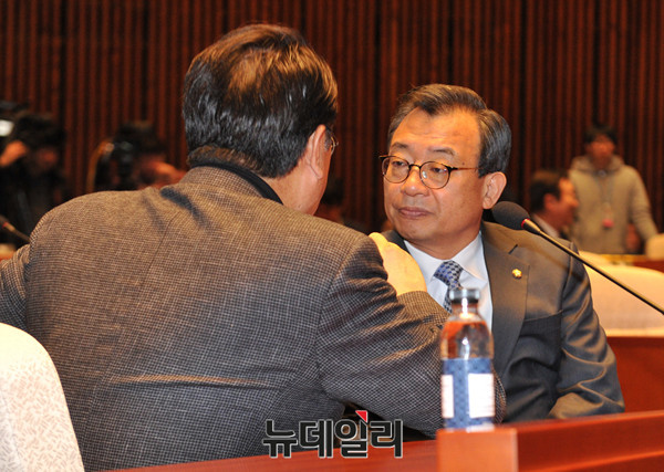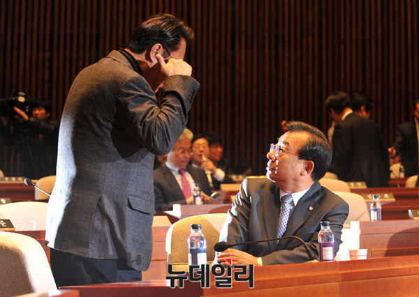 새누리당 이정현 대표가 25일 오전 국회에서 열린 의원총회에 참석해 정진석 원내대표와 대화를 나누고 있다.
