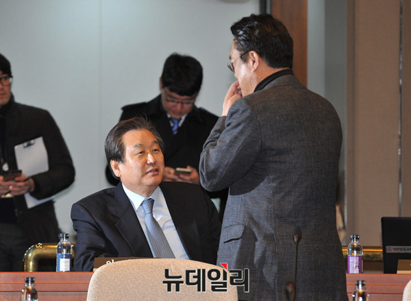 새누리당 정진석 원내대표가 25일 오전 국회에서 열린 의원총회에 참석해 김무선 전 대표와 대화를 나누고 있다.