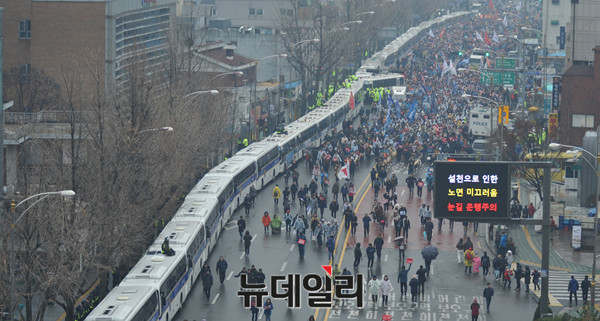박근혜 대통령의 퇴진을 촉구하는 촛불집회가 열린 26일 오후 서울 종로구 청와대 200m 앞인 청운효자동 주민센터에서 앞으로 시위대가 "박근혜 하야" 구호를 외치며 행진하고 있다.