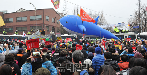 박근혜 대통령의 퇴진을 촉구하는 촛불집회가 열린 26일 오후 서울 종로구 청와대 200m 앞인 청운효자동 주민센터에서 앞에서 시위대가 세월호를 상징하는 고래 조형물을 옮기고 있다.