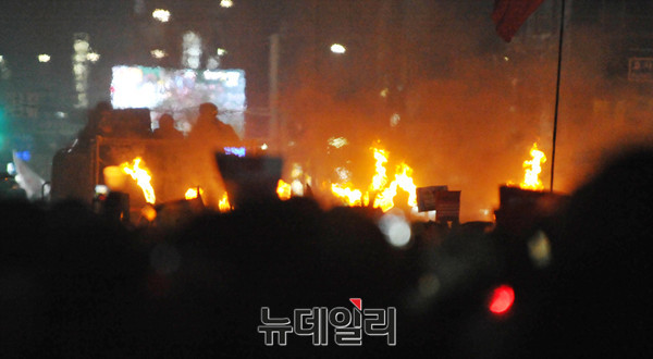 박근혜 대통령 퇴진을 촉구하는 촛불 집회가 26일 오후 서울 광화문광장에서 열린 가운데 참가자들 중 일부가 횃불을 들고 행진을 하고 있다.