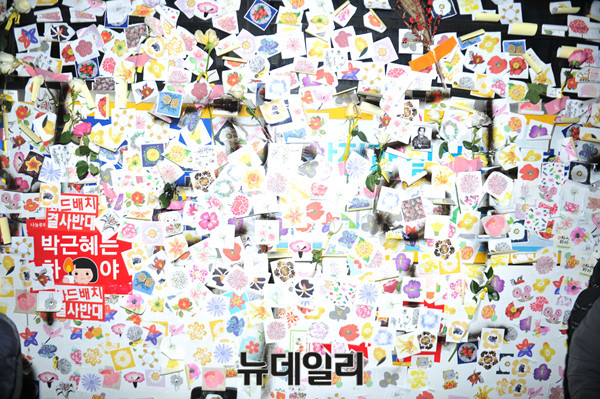 박근혜 대통령의 퇴진을 촉구하는 촛불 집회가 26일 오후 서울 광화문광장에서 열린 가운데 참가자들이 붙이 꽃 스티커가 경찰차벽에 붙어 있다.