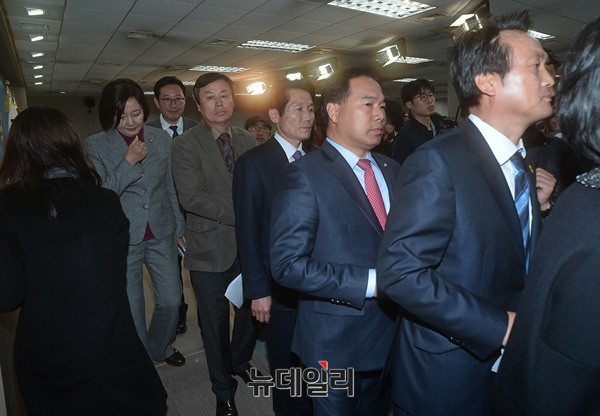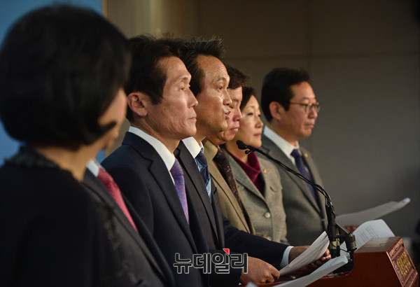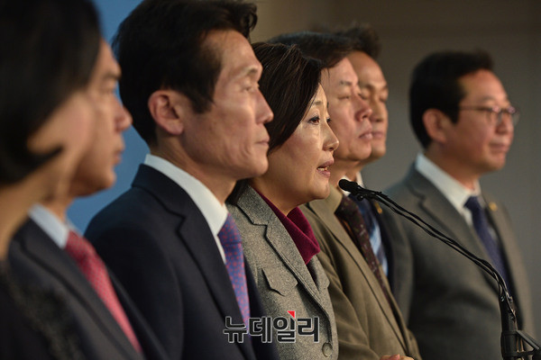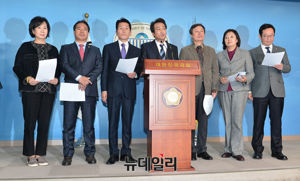 손혜원 더불어민주당 의원, 이용주 국민의당 의원, 윤소하 정의당 의원, 안민석, 도종환, 박영선, 김한정 더불어민주당 의원(왼쪽부터)이 28일 오전 국회 정론관에서 기자회견을 열고 "새누리당의 성의있는 태도변화, 검찰총장의 국조특위 출석 등"을 요구했다.