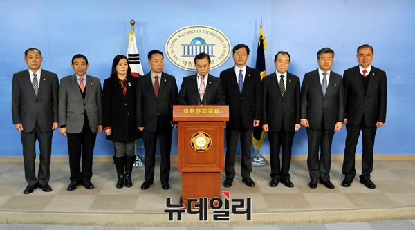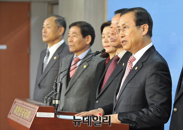대한민국 육해공군해병대 예비역 대령 연합회 양태호 회장 및 회원들이 28일 오전국회 정론관에서 한일 군사비밀정보보호협정 지지 기자회견을 갖고 있다.