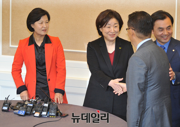 야3당 대표 (더불어민주당 추미애, 국민의당 박지원, 정의당 심상정)가 30일 국회 귀빈식당 회동에서 인사를 나누고 있다.