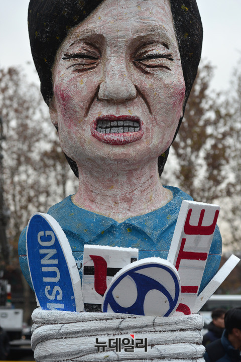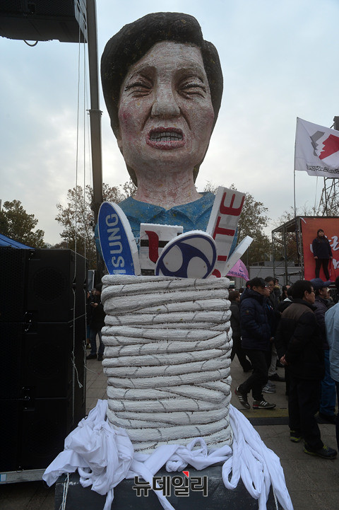 민주노총이 30일 오후 서울광장에서 진행된 총파업 대회에서 박근혜 대통령과 대기업 로고를 결박해 놓은 인형을 전시했다. 민노총은 "박근혜 정권 퇴진은 모든 정책을 폐기하는 것이어야 한다"고 주장했다.