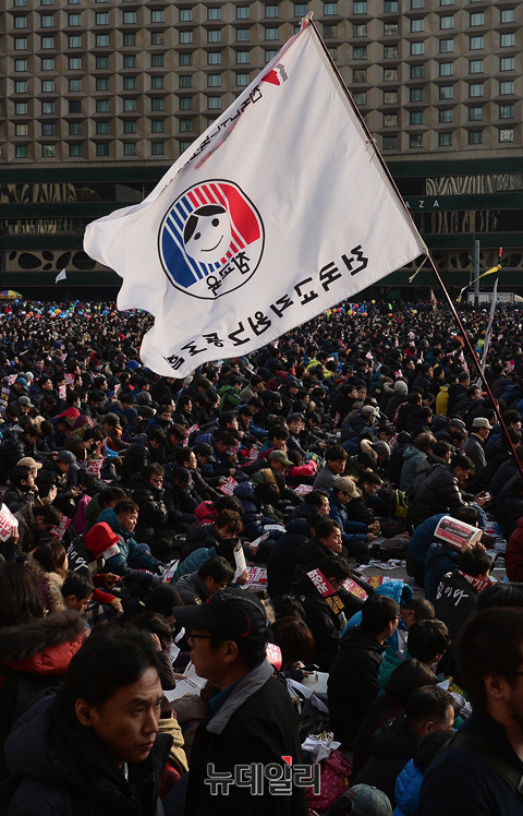 민주노총이 30일 오후 3시부터 서울광장에서 박근혜 대통령 퇴진을 요구하며 총파업에 돌입했다. 이날 총파업에 동참한 전교조 깃발이 펄럭이고 있다. 민노총은 "박근혜 정권 퇴진은 모든 정책을 폐기하는 것이어야 한다"고 주장했다.
