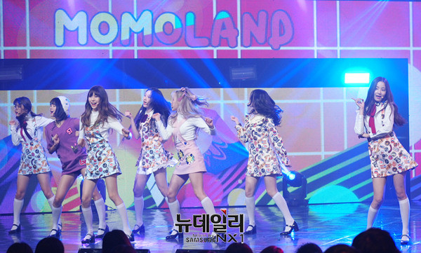 그룹 모모랜드(MOMOLAND : 혜빈, 연우, 제인, 나윤, 아인, 주이, 낸시)가 30일 오후 일산 MBC드림센터에서 열린 생방송 '쇼 챔피언(SHOW CHAMPION)'에서 신곡'짠쿵쾅'을 열창하고 있다.