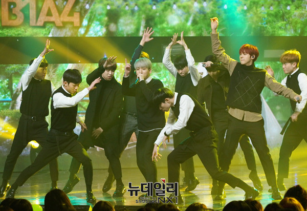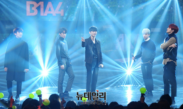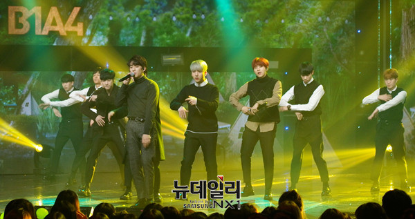 그룹 비원에이포(B1A4 : 산들, 바로, 진영, 신우, 공찬)가 30일 오후 일산 MBC드림센터에서 열린 생방송 '쇼 챔피언(SHOW CHAMPION)'에서 신곡 '꿈에'를 열창하고 있다.