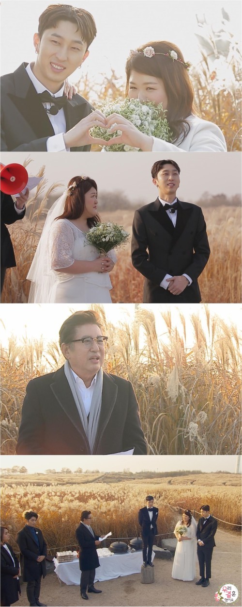 '우결' 슬리피-이국주가 원빈-이나영의 결혼식을 재현한다.3일 방송될 MBC '우리 결혼했어요'(이하 '우결')에서는 새로운 커플로 합류한 슬리피 이국주의 결혼식 현장이 공개된다.앞서 이국주는 꿈꾸던 결혼식으로 원빈-이나영의 밀밭 결혼식을 언급했고, 슬리피 역시 이국주의 생각에 동의하며 시작부터 마음이 잘 맞는 모습을 보여줬다.제작진에 따르면 슬리피-이국주는 하늘공원 갈대밭 웨딩마치로 결혼 로망을 실현, 각자 준비한 예복을 입고 하객들을 맞으며 떨리는 마음 주체하지 못했다.그런 가운데, 슬리피-이국주의 결혼식 사진이 공개돼 눈길을 끈다. 두 사람은 갈대밭을 배경으로 둘 만의 특별한 웨딩촬영을 하며 아름다움이 극대화된 모습을 보여주고 있다.슬리피의 절친한 동생 딘딘은 "역사적인 순간입니다! 신랑신부 입장!"이라며 결혼식의 시작을 알렸고, 이에 맞춰 슬리피-이국주는 팔짱을 낀 채 수줍음을 마구 분출하며 묘한 분위기를 형성시켰다.또한 '나 혼자 산다'를 통해 이국주와 인연을 맺은 김용건이 감동 깊은 축사로 두 사람의 결혼을 열렬히 축하했다. 슬리피-이국주의 갈대밭 결혼식 현장은 3일 오후 4시 55분 '우리 결혼했어요'를 통해 확인할 수 있다.['우리결혼했어요' 슬리피 이국주, 사진=MBC]