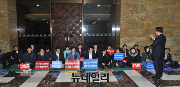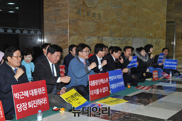 더불어민주당, 정의당 의원들이 2일 오전 국회 로텐더홀에서 박근혜 대통령 탄핵안 발의 촉구 농성을 하고 있다.