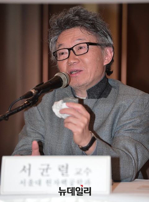 서균렬 서울대 원자핵공학과 교수가 2일 오후 한국프레스센터에서 열린 '중·북 핵공모와 아시아 안보질서의 미래' 포럼에서 핵과 관련된 설명을 위해 우라늄 원석을 내보이고 있다.