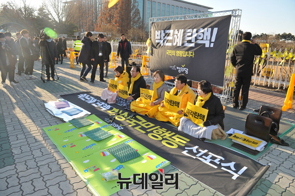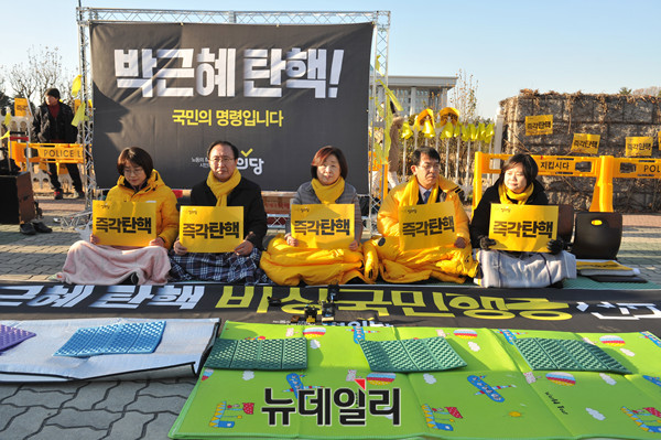 정의당 심상정 대표와 노회찬 원내대표 등 소속 의원들이 2일 오후 국회 정문 앞에서 '박근혜 대통령의 즉각적인 탄핵'을 주장하며 '비상국민행동 선포식'을 한 뒤 피켓시위를 하고 있다.