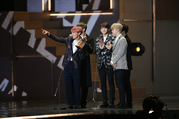 그룹 방탄소년단(랩몬스터, 슈가, 진, 제이홉, 지민, 뷔, 정국)이 지난 2일 홍콩 아시아월드엑스포(AsiaWorld-Expo)에서 열린 '2016 마마(Mnet Asian Music Awards)'시상식에서 베스트 댄스 퍼포먼스 상을 수상했다. (사진=CJ E&M)