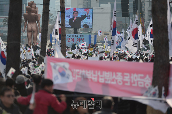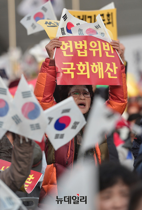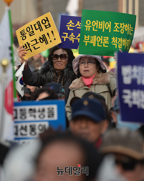 박근혜 대통령 하야를 반대하는 집회가 3일 오후 서울 동대문디자인플라자 일대에서 진행된 가운데 집회참가자가 손피켓을 들고 하야를 반대하고 있다.