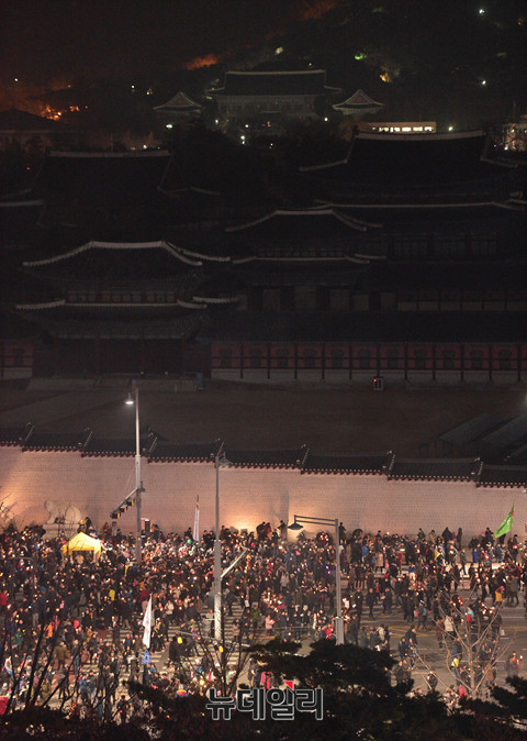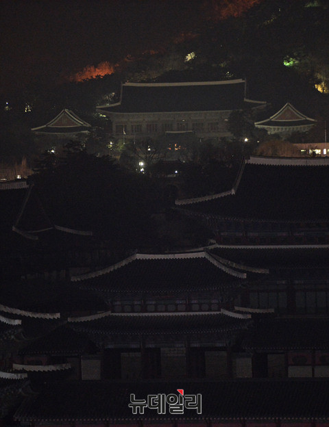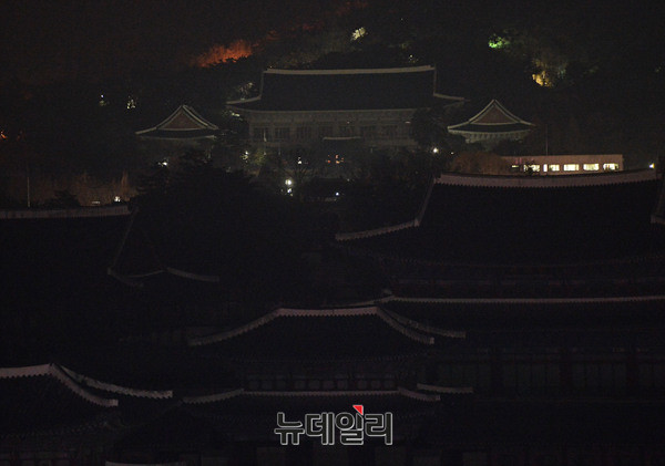 박근혜 대통령 퇴진을 촉구하는 떼촛불집회가 3일 오후 광화문 일대에서 진행된 가운데 경복궁 뒤로 보이는 청와대에는 불이 꺼져있다.